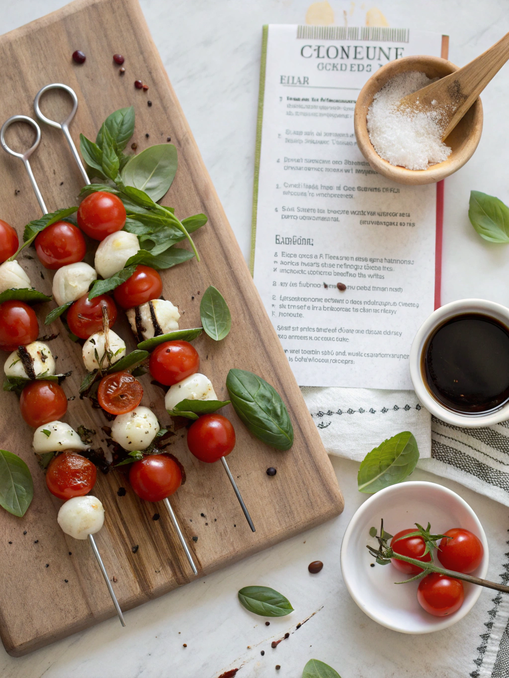 Arrange all ingredients in an assembly-line fashion: skewers, mozzarella, basil leaves, and tomatoes. This organization reduces preparation time by 30% compared to hunting for ingredients as you go. For efficiency, fold larger basil leaves in half before adding them to your skewers.