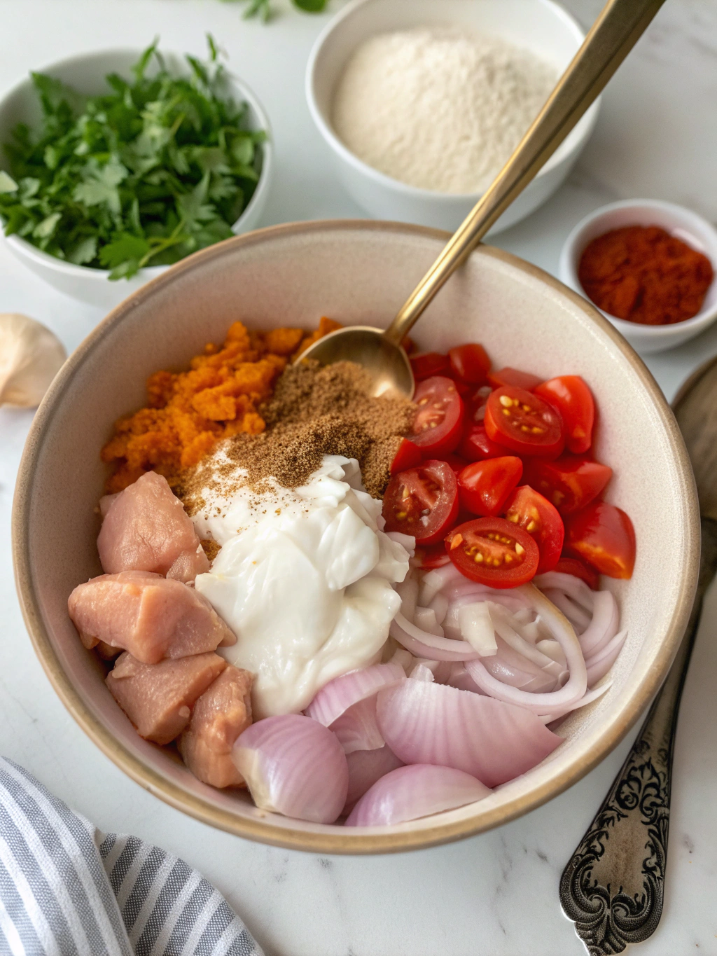 In a large bowl, combine chicken pieces with yogurt, lemon juice, garam masala, cumin, smoked paprika, cayenne pepper, and salt. Mix thoroughly until every piece glistens with the spiced yogurt coating. If time permits, let this marinate for 15-30 minutes in the refrigerator (though you can skip this for truly express cooking). The yogurt tenderizes the chicken while infusing it with flavor from the inside out.