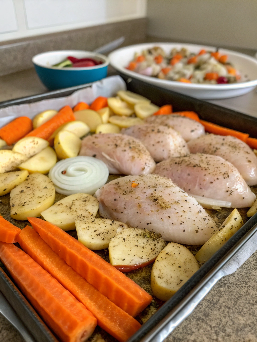 Spread the seasoned chicken pieces evenly on one side of the prepared sheet pan. Arrange the vegetables on the other side, ensuring everything is in a single layer. Overcrowding the pan will cause steaming rather than roasting, so use two pans if necessary.