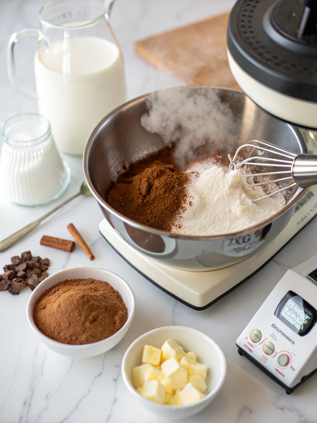 Place milk, chocolate pieces, cocoa powder, sugar, vanilla extract, and salt into your Thermomix bowl. The order matters less than in conventional cooking because the Thermomix will thoroughly blend everything. For extra indulgence, use whole milk, which contains about 3.5% fat, creating a creamier texture than lower-fat alternatives.