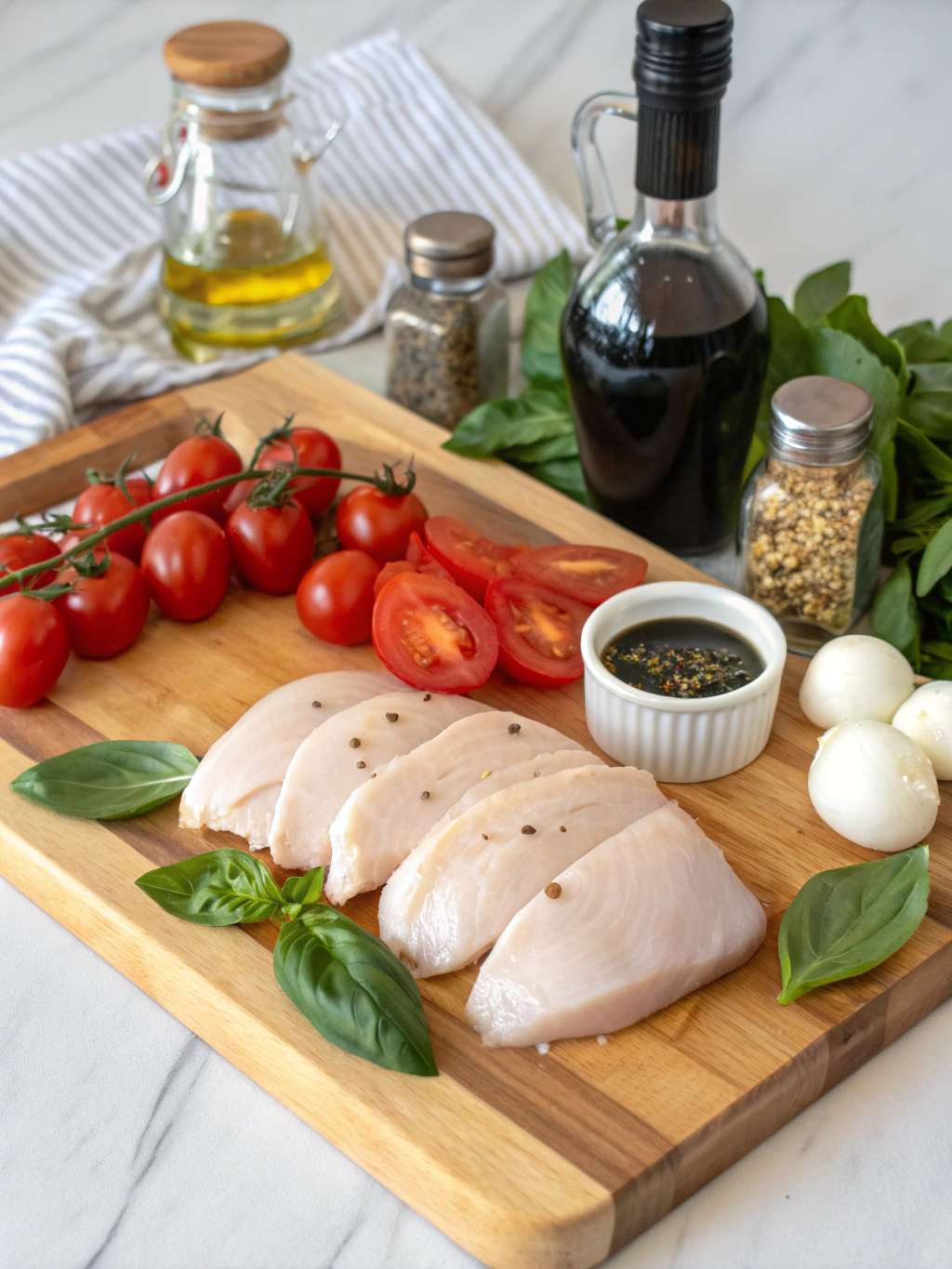 Remove the skillet from heat and immediately tear fresh basil leaves over the top—the residual heat will release the basil's aromatic oils without wilting it completely. Drizzle the balsamic vinegar over everything, creating those classic Caprese flavor notes. The vinegar's acidity cuts through the richness of the cheese and adds a sophisticated tang that elevates this weeknight chicken meal from simple to sublime.