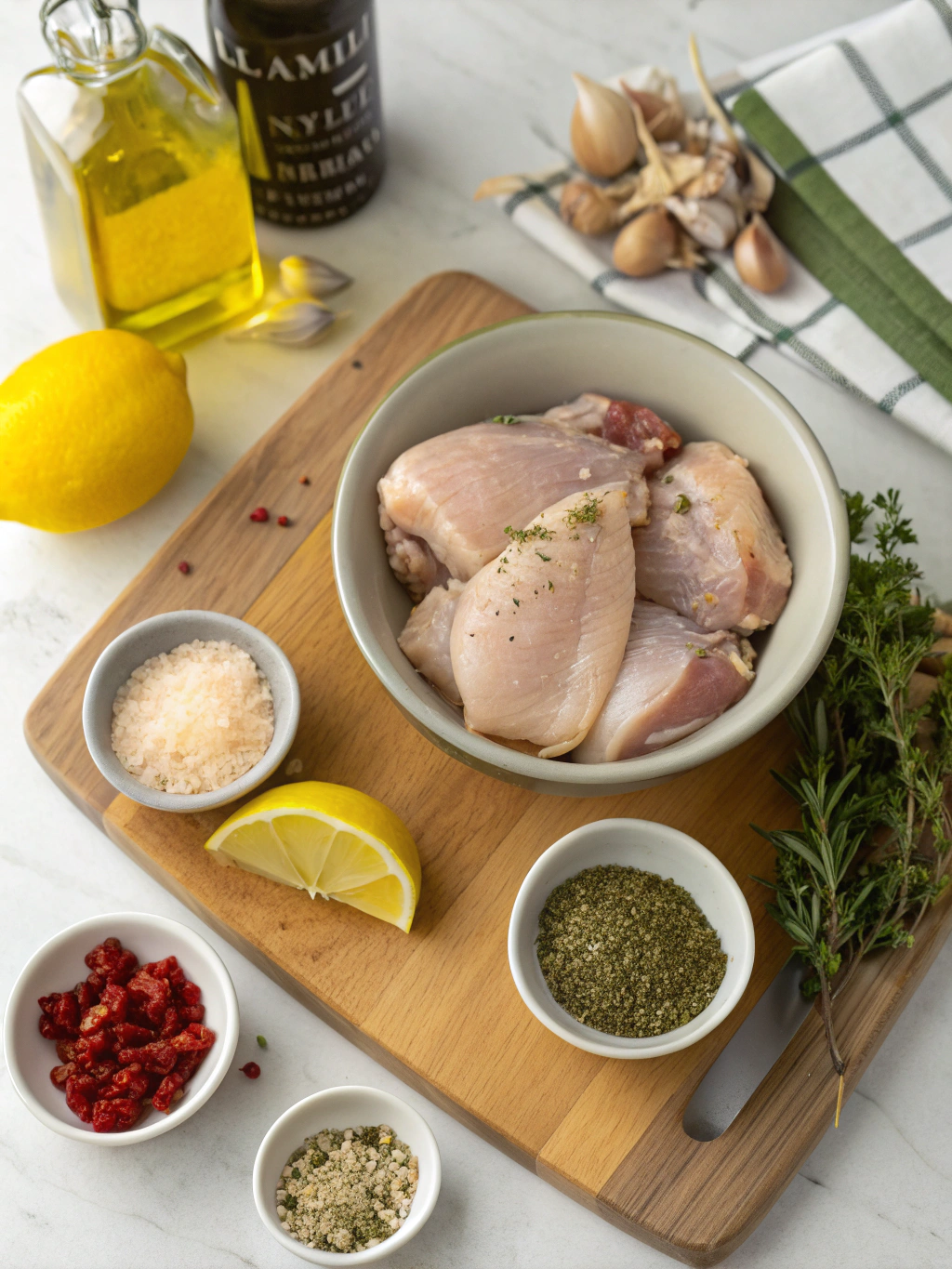 In a large bowl, combine 2 tablespoons olive oil, minced garlic, lemon zest, oregano, thyme, paprika, cumin, salt, and pepper. Add the chicken thighs and toss until thoroughly coated. For maximum flavor, push some of the seasoning mixture under the skin – this chef’s trick ensures the seasoning permeates the meat rather than just sitting on the surface.