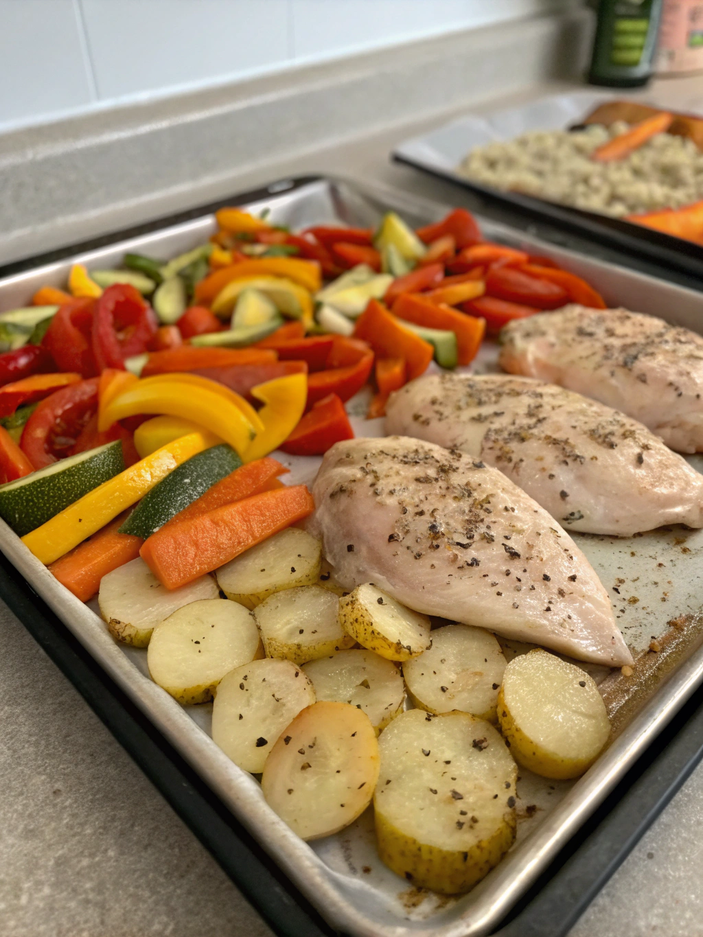 Slide the sheet pan into your preheated oven and bake for 18-22 minutes, or until the chicken reaches an internal temperature of 165°F (74°C) when measured with a meat thermometer at the thickest part. The vegetables should be tender with slightly charred edges, adding depth of flavor to this quick weeknight meal.