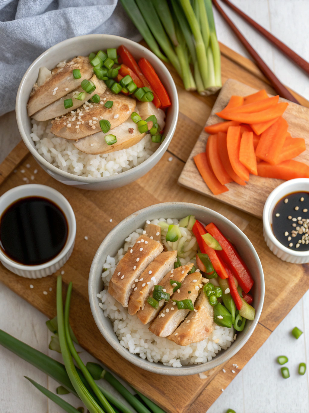 Present your teriyaki chicken rice bowls family-style by setting out the components separately, allowing everyone to customize their bowls according to preferences—kids might prefer more rice and less vegetables, while health-conscious adults can load up on greens.