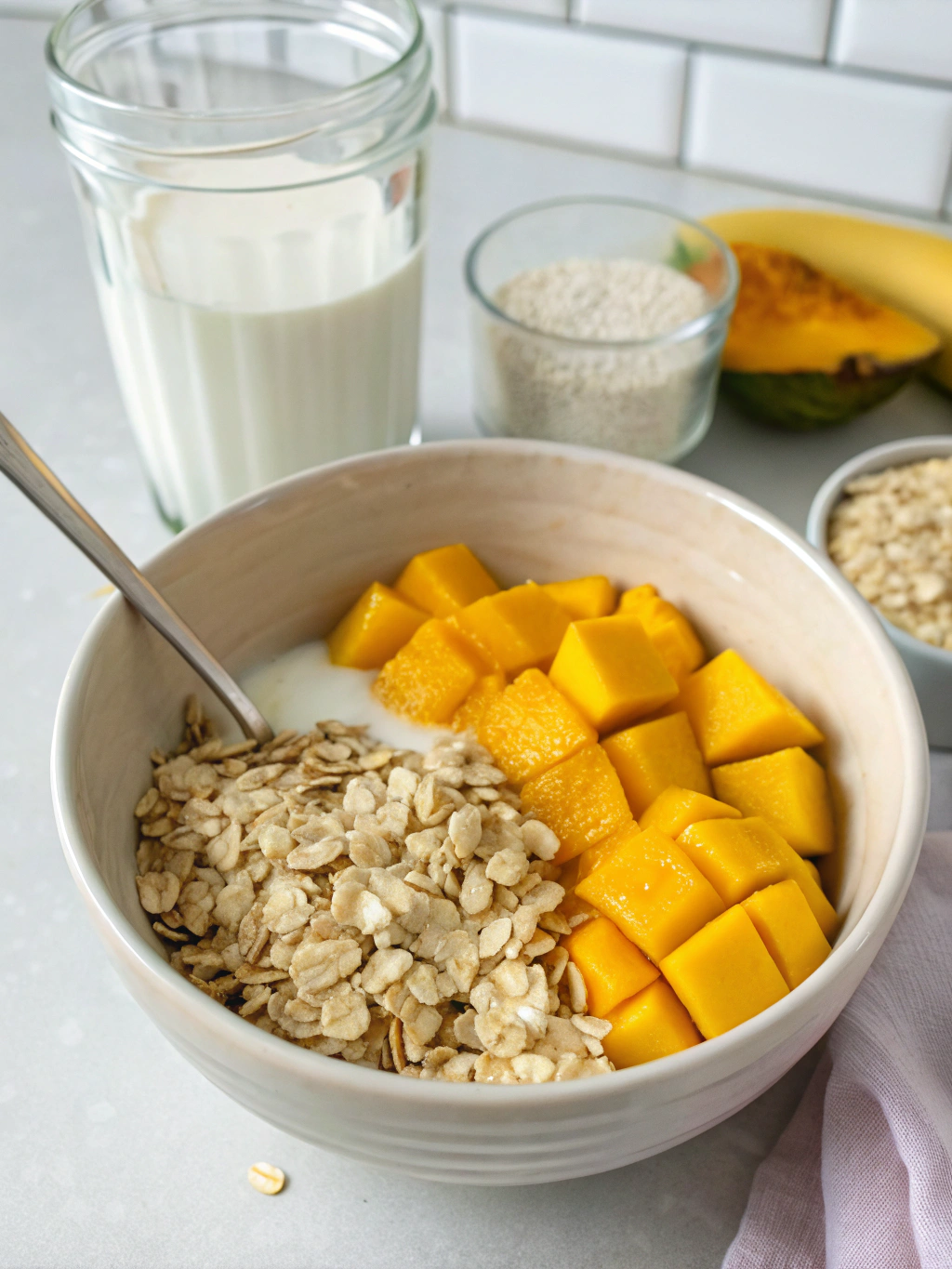 Pour your completed oatmeal smoothie recipe into a glass or bowl. For an Instagram-worthy presentation, top with additional diced mango, a sprinkle of granola, coconut flakes, or a dusting of cinnamon.