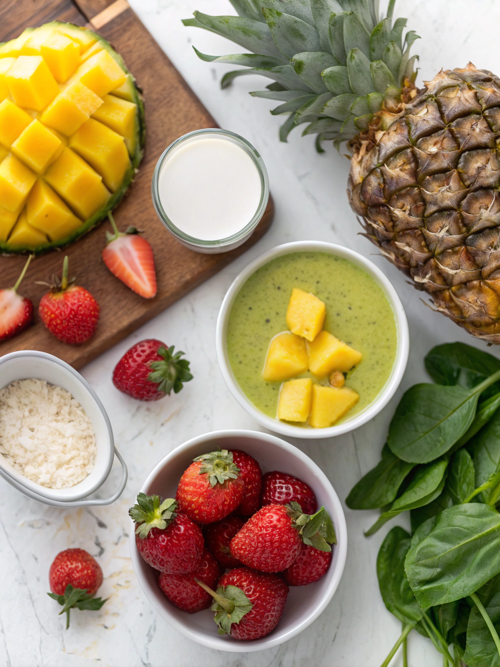 Peel and cut the mango, banana, pineapple, and papaya into chunks that your blender can easily process. Pro tip: Use slightly overripe mangoes and bananas for natural sweetness, reducing the need for added sweeteners.