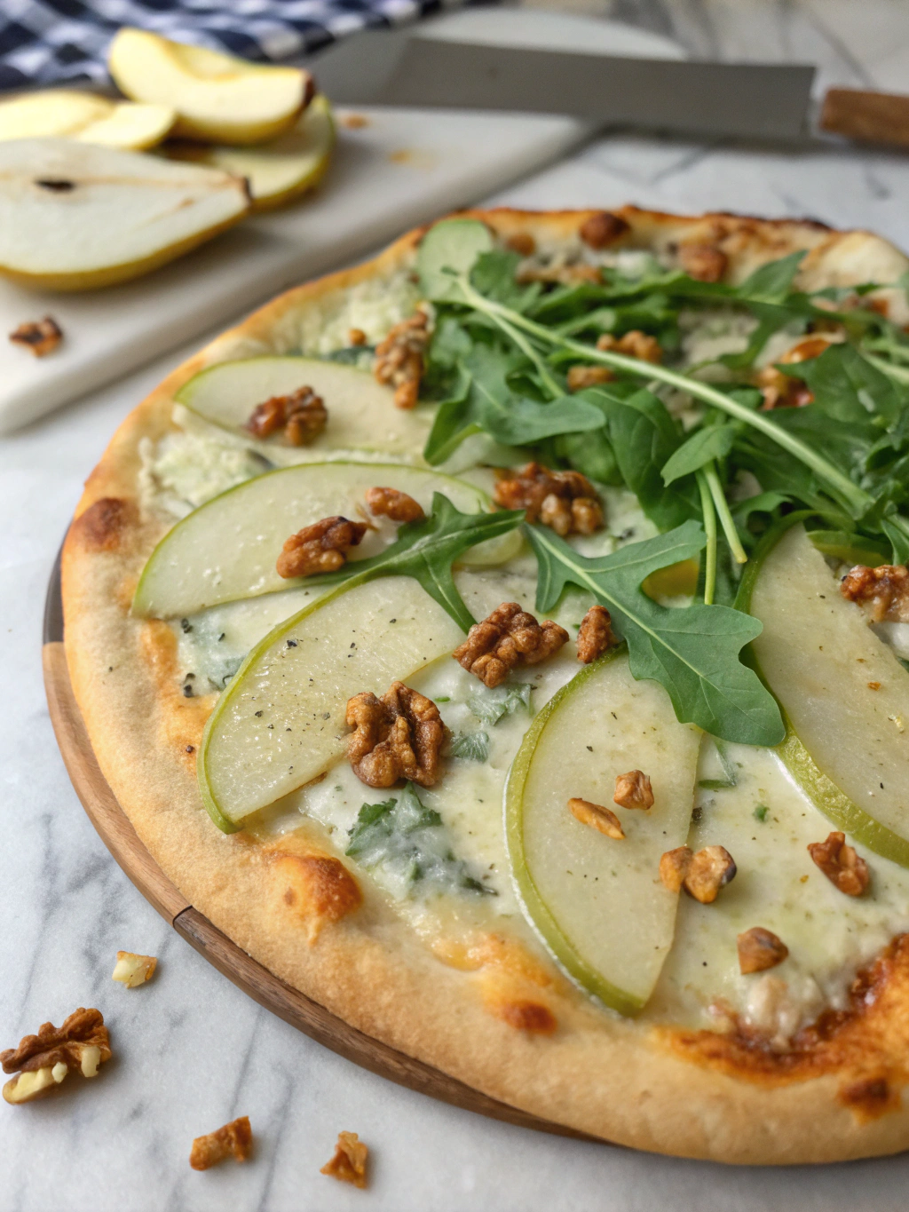 The sweet juiciness of the pears balances perfectly with the sharp tanginess of the gorgonzola, while the walnuts add an essential textural crunch that elevates this 30-minute pizza recipe to restaurant quality.